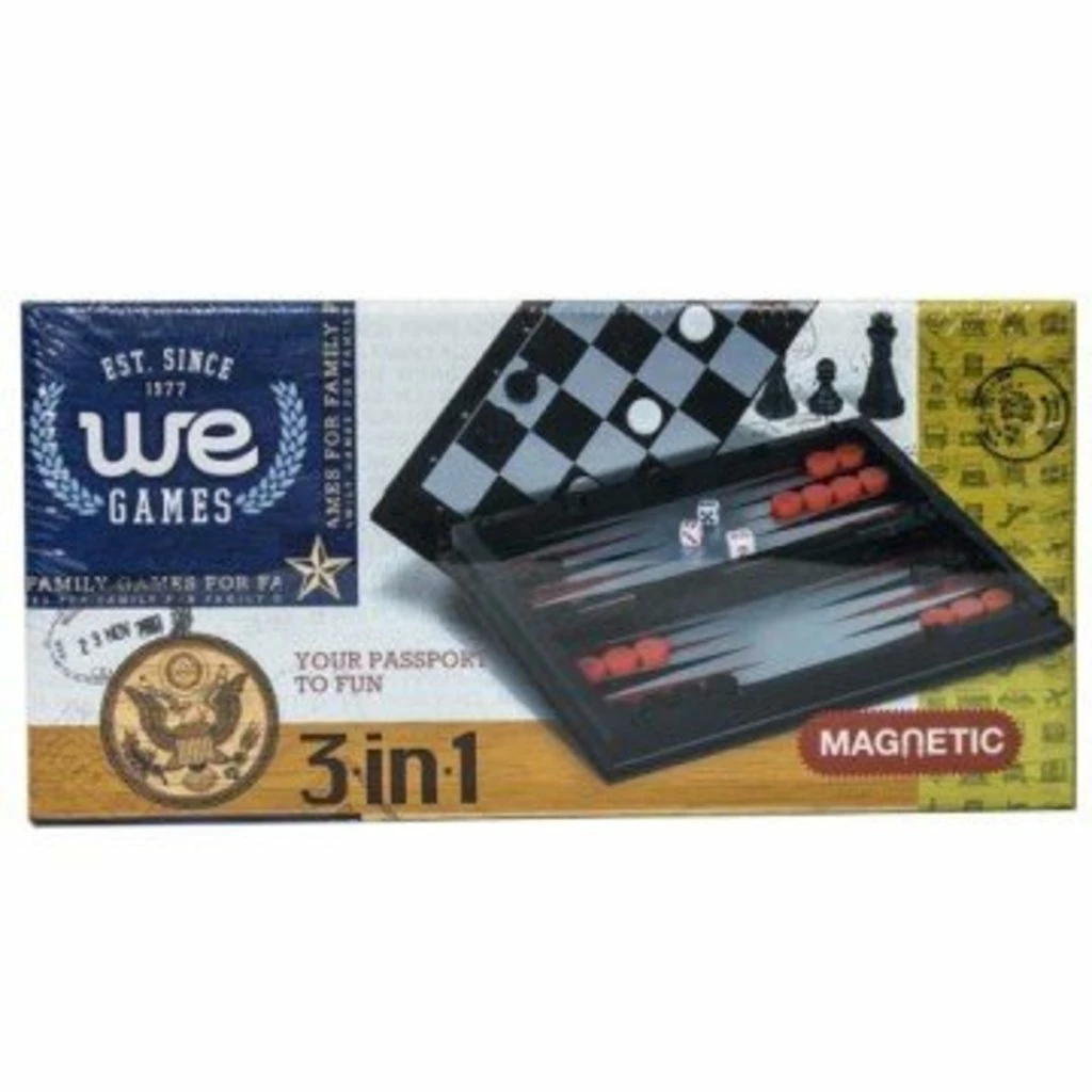 This is a great travel set that includes Chess, Checkers, and Backgammon! All playing pieces are inside, including a pair of dice and a doubling cube. The board is reversible and features a magnetized side for Chess and Checkers and on the inside is a board for backgammon that is also magnetized for steady and sure play on the go. A great set for family vacations, business trips with colleagues, and anywhere where you want the challenge of classic games in a size that fits right in your bag.