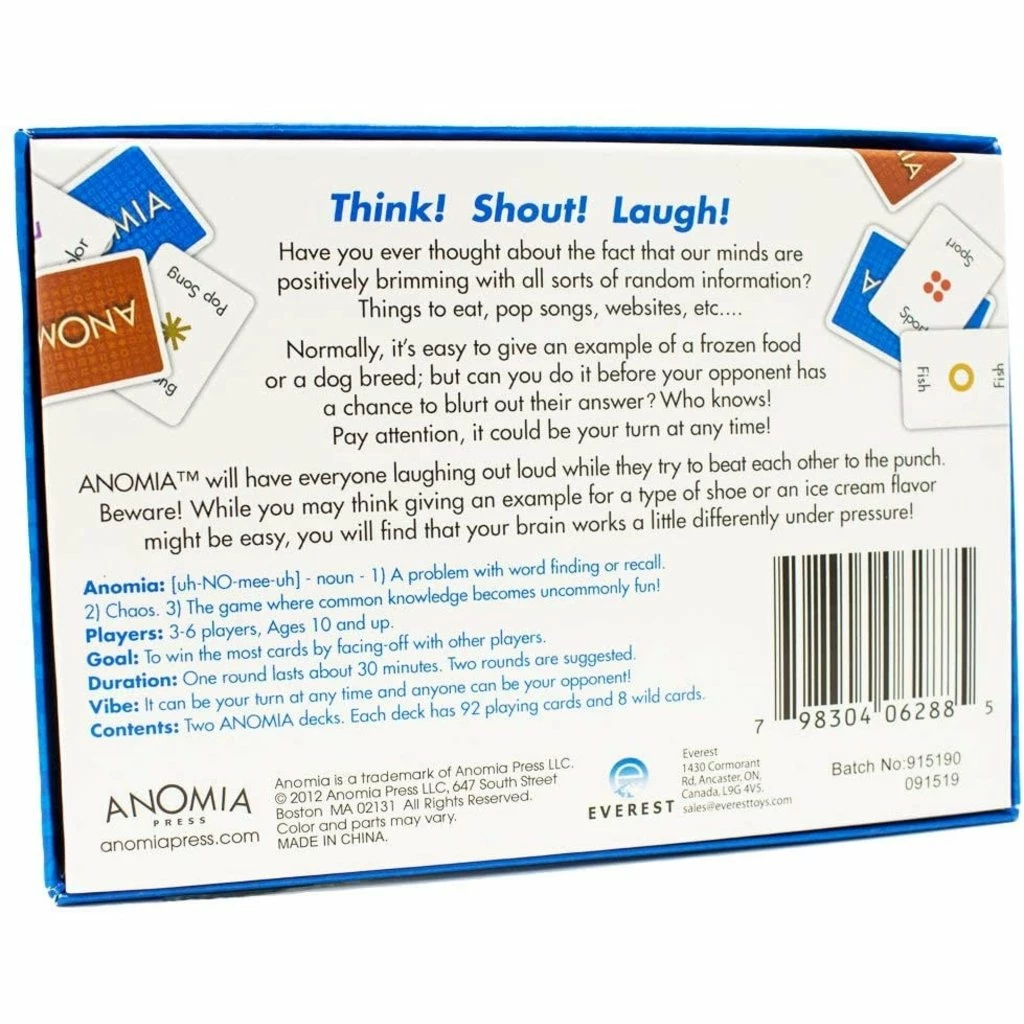 Anomia™ plays off the fact that our minds are positively brimming with all sorts of random information; things to eat, pop songs, websites, etc… Sure, under normal circumstances, it’s easy enough to give an example of a frozen food, or a dog breed; but you will find that your brain works a little differently under pressure! Easy to learn, fun to play over and over again, Anomia will have any group of friends, family, even perfect strangers, shouting and laughing out loud as they try to beat each other to the punch!
