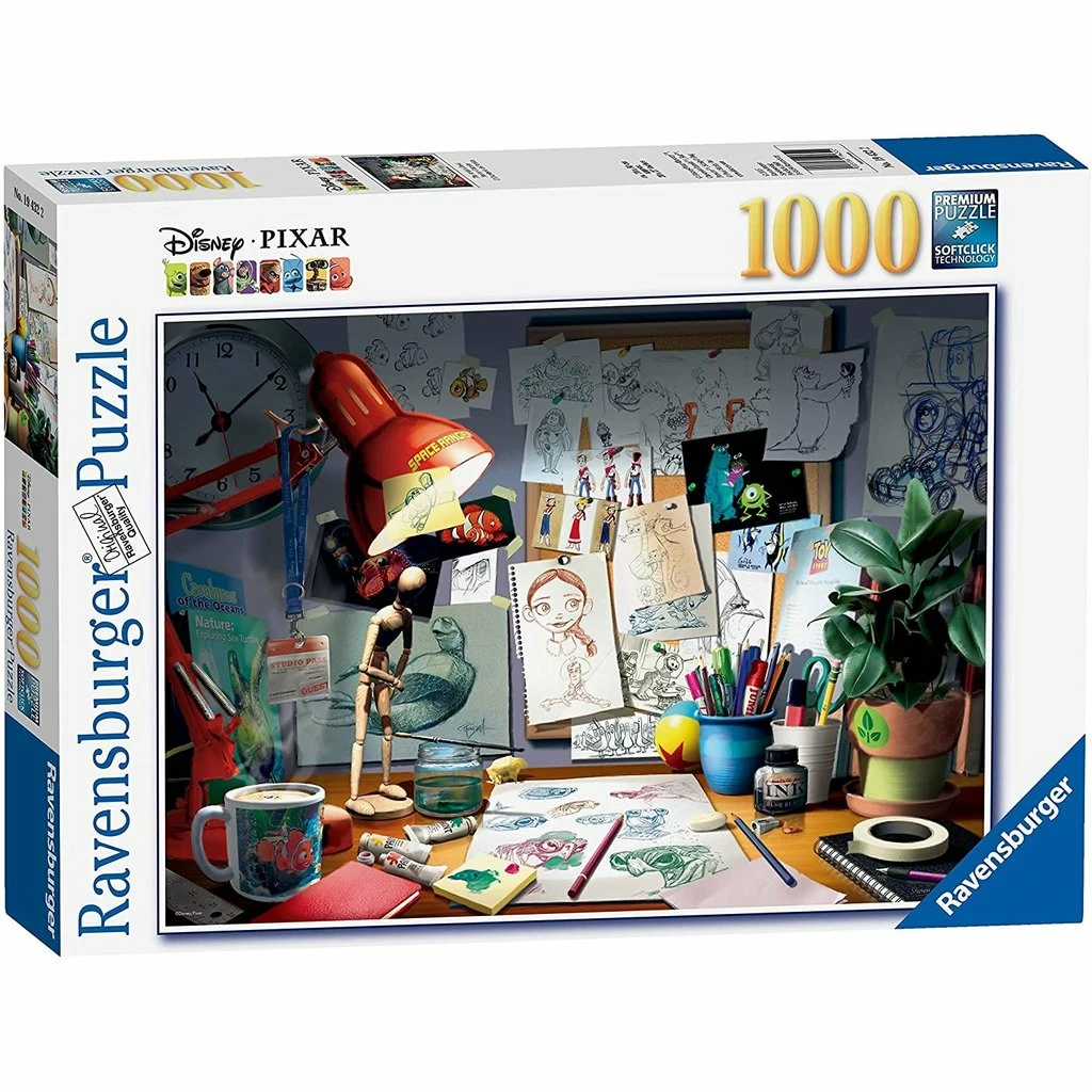 - Piece together this 1000-piece puzzle, featuring the world of Pixar animation from the view of The Artist’s Desk.
