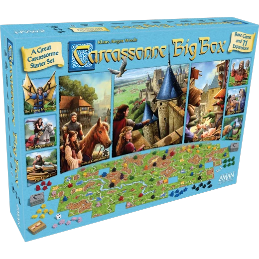 The sixth edition of the Carcassonne Big Box contains the Carcassonne base game, the Inns & Cathedrals and Traders & Builders expansions, the mini-expansions The River and The Abbot now included with the base game, and the six mini-expansions from 2012: Carcassonne: The Flying Machines, Carcassonne: The Messengers, Carcassonne: The Ferries, Carcassonne: The Gold Mines, Carcassonne: Mage & Witch, and Carcassonne: The Robbers; these six each include one of the six tiles for the Carcassonne: The Corn Circles II/Crop Circles II mini expansion.