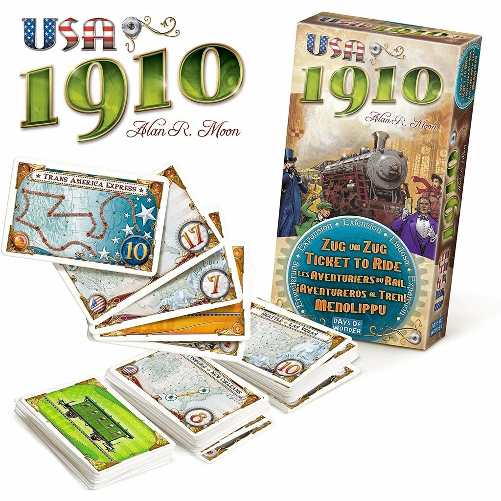Ticket to Ride – USA 1910 is a card expansion for the original Ticket to Ride board game. It consists of 181 new large format cards (the same size as Ticket to Ride Europe and Märklin), that include: 35 new Destination Tickets, a new GlobeTrotter bonus card for completing the most tickets, plus a complete replacement deck of all the cards from the original game deck. Also included is a new rulebook that gives Ticket to Ride players three new ways to play the game including 1910 rules – games using only the new Destination Tickets; the Mega Game, featuring all the tickets; and Big Cities, which uses only tickets to certain large cities.