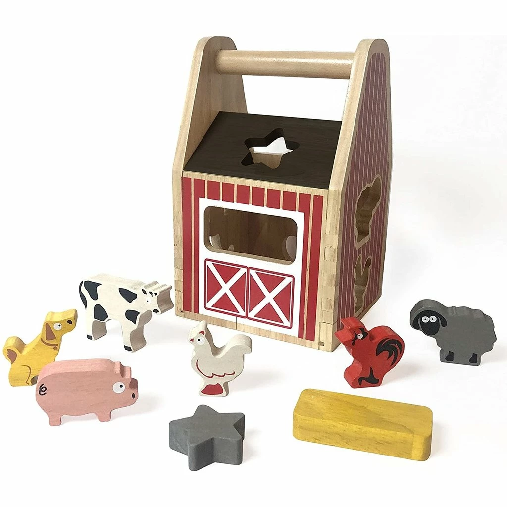 The Barnyard Shape Sorter is one part playset and one part learning toy. This ultimate shape sorter features 8 farm characters and objects, vibrantly colored that fit nicely into the natural-finish hardwood barn. This toy has a wooden handle built in and is great for kids on the go.
