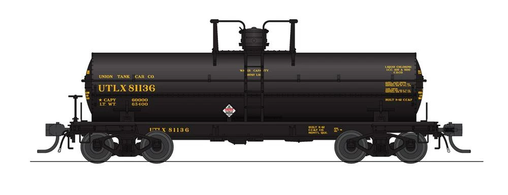 BLI is pleased to deliver the Type 27 tank car which is the slightly elongated younger sibling of the Type 21 tank car. These insulated high pressure cars were used often in the transport of the home heating fuels propane and butane as well as anhydrous ammonia, chlorine, and methyl chloride. They are modeling the 6000 gallon car that often hauled liquid chlorine.