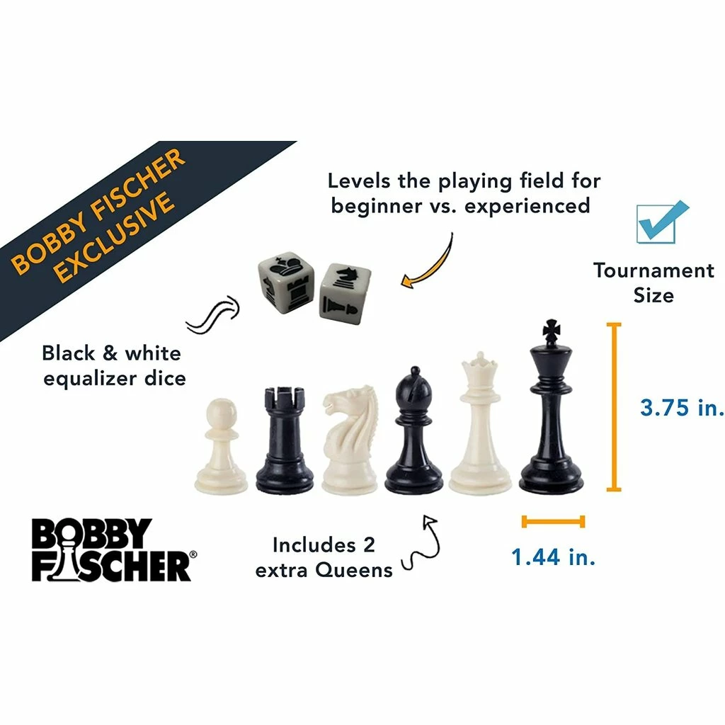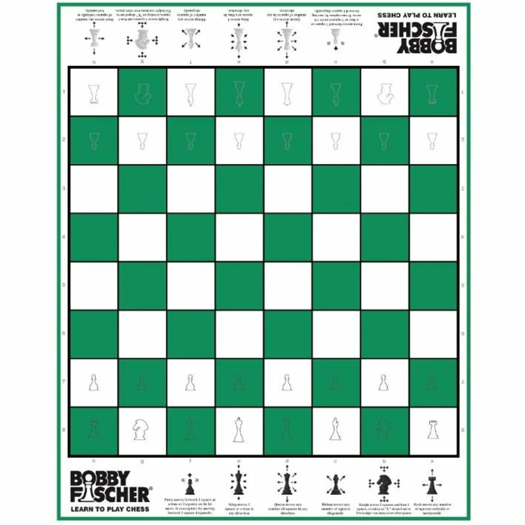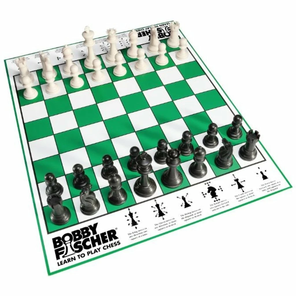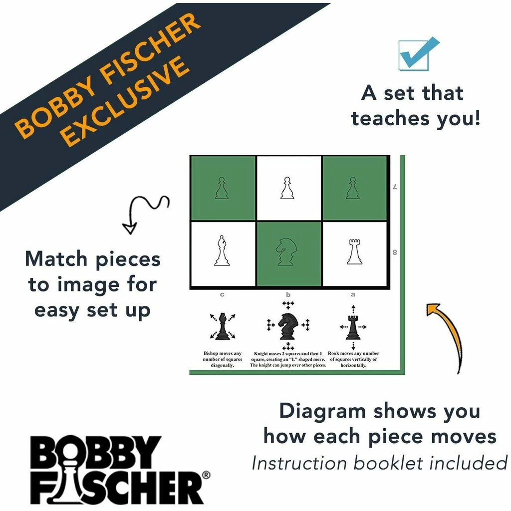 Learn to Play Chess on the specially designed chess set, a nod to Bobby Fischer who was the great American Chess Grandmaster! This complete chess set is uniquely designed to teach you how to set up the pieces and how each piece may be moved during the game. Refer to it often: the guidelines printed on the game will reinforce the basics as you make your moves. Chess is simple to learn and challenging to master. While enjoying the game of chess you are also learning vitally important skills such as critical thinking, math development, concentration and socialization.