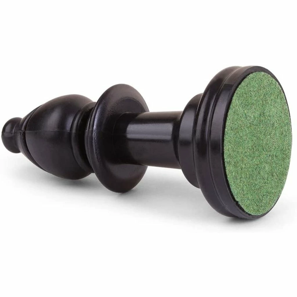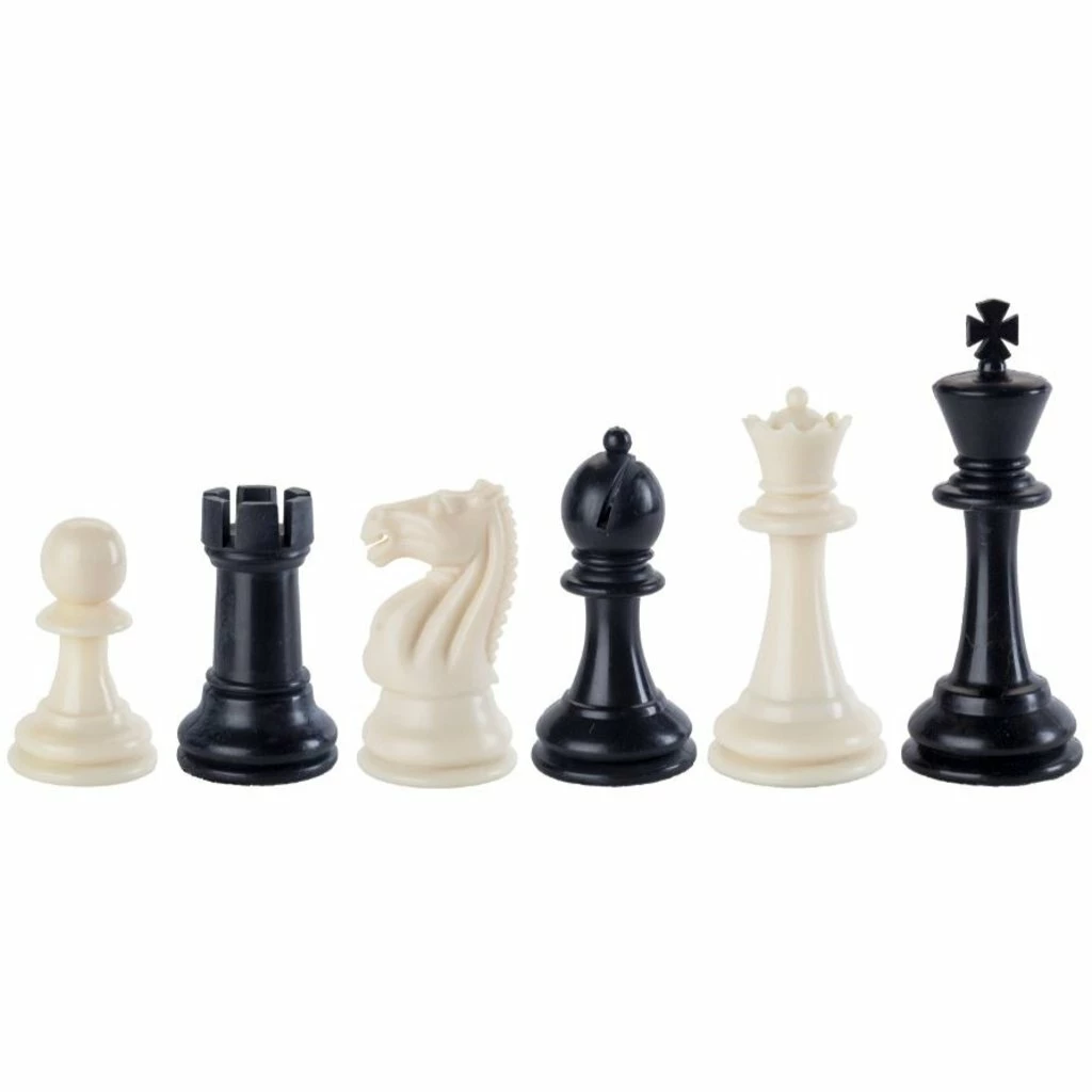 - Staunton style chess pieces are black and white plastic.