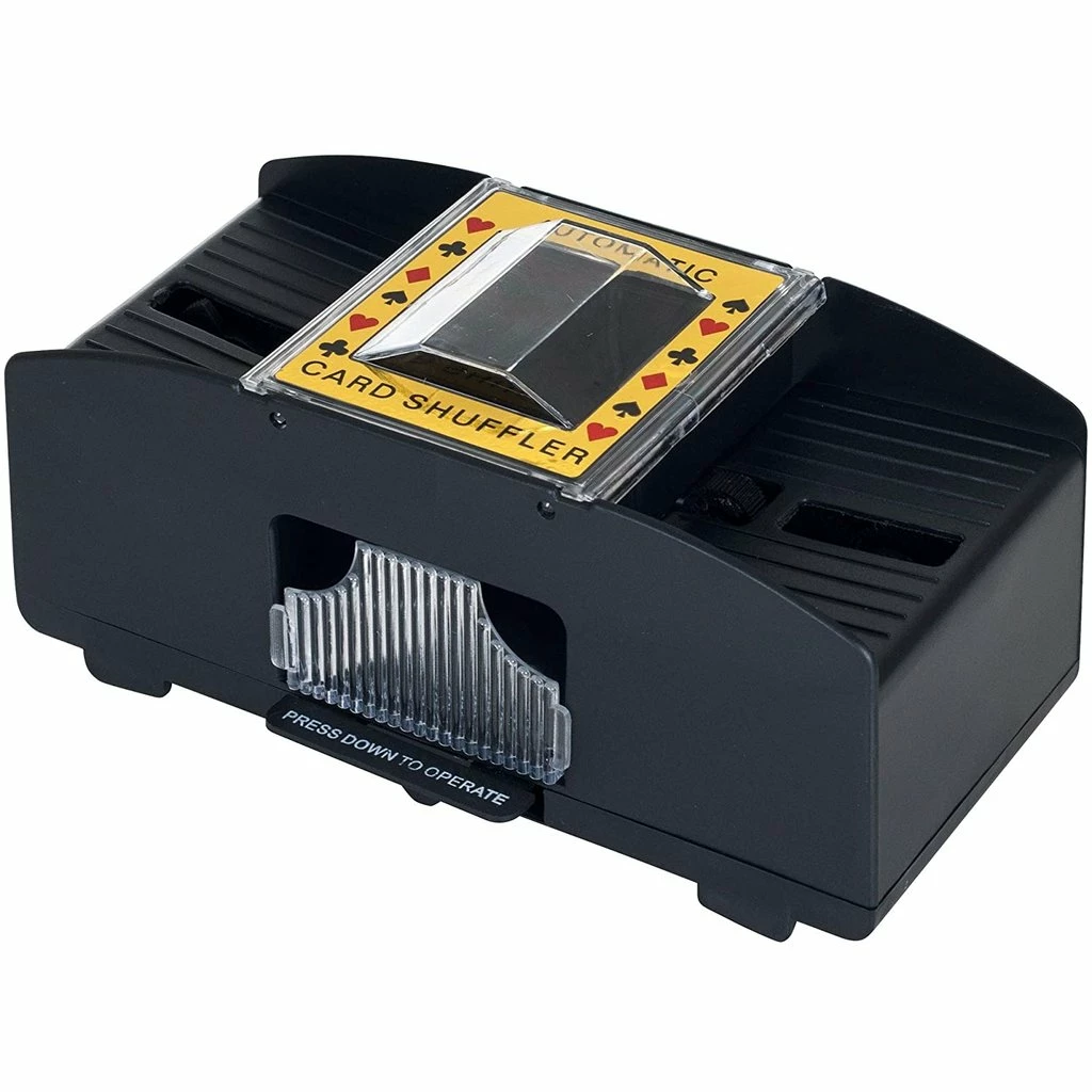 This 2-Deck Automatic Card Shuffler from John Hansen Co. is a great addition to your family card game night! It shuffles one or two decks of cards with the touch of a button! Battery operated means you can bring it with you anywhere! This shuffler uses innovative gears on each side to evenly and accurately drive the playing cards into the tray in a swift and smooth motion. This automatic dispenser is perfect for any home game room! It’s a great aid for people who need help shuffling cards.