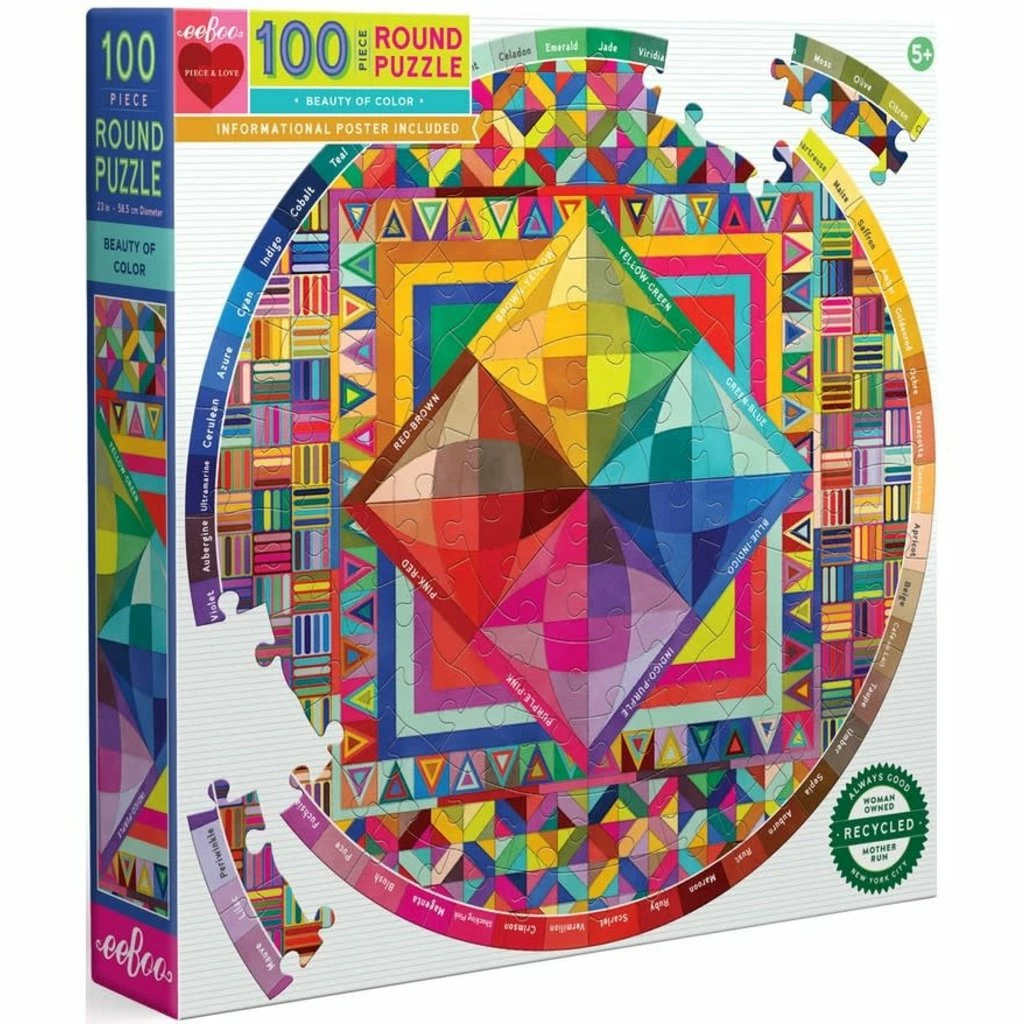 The Beauty of Color puzzle celebrates the great variety of colors in our world and some of the many words we use to describe them. A rich color vocabulary enhances visual acuity and lends precision to how we communicate what we see. This 100-piece round puzzle is a special hybrid for older children who are ready for more advanced themes and a higher piece count, as well as for adults who want a simpler “snack” puzzle.
