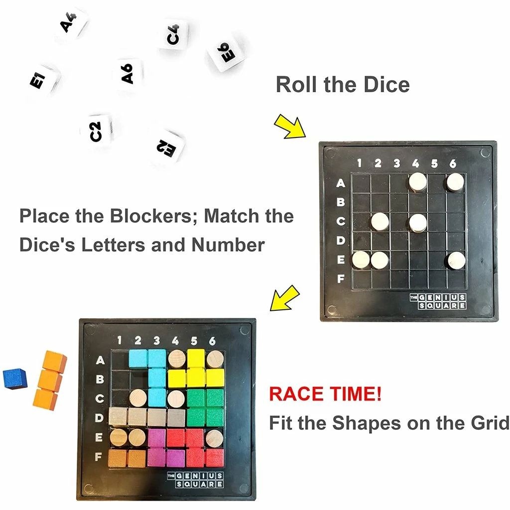 - The Genius Square is a well-designed table game and includes grids, dice, blockers, and 9 different shapes with different colors. Easy to travel with and simply have fun!