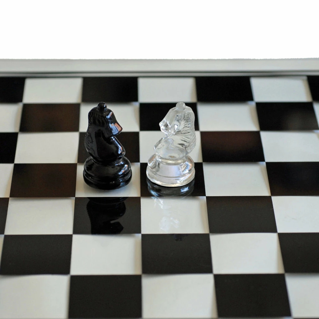 Looking for a unique chess set with modern appeal? This black and clear Glass Chess Set is big on style! The clear and black glass chess pieces are easily discernible and are a beautiful compliment to the elegant chess board. Measurements include a 14 inch chess board with 1.5 inch squares and a 3 inch King.
