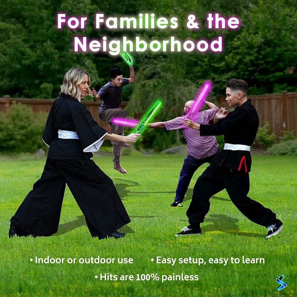 This premium game kit includes newly improved foam swords, dojo markers and batteries you’ll need for a dozen or more games: