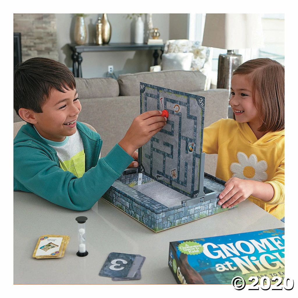 Queen Benevolence is hosting a celebration to honor her loyal subjects. To thank them, she will give away 12 extraordinary items from her treasure box that she keeps hidden away in a secret chamber in the castle. But when the Queen goes to choose the items that she wants to bestow, she discovers the box is empty! A thief has stolen her treasures and is running away with them! The celebration cannot happen without the treasures and there is not much time before daybreak and the start of the party. The treasures much be found! Luckily, the trusty gnomes are here to help! Players work together to maneuver the magnetic gnome movers around the mazes to collect all the treasures before time runs out. Use communication, strategy and quick thinking to find the treasures and win the game!