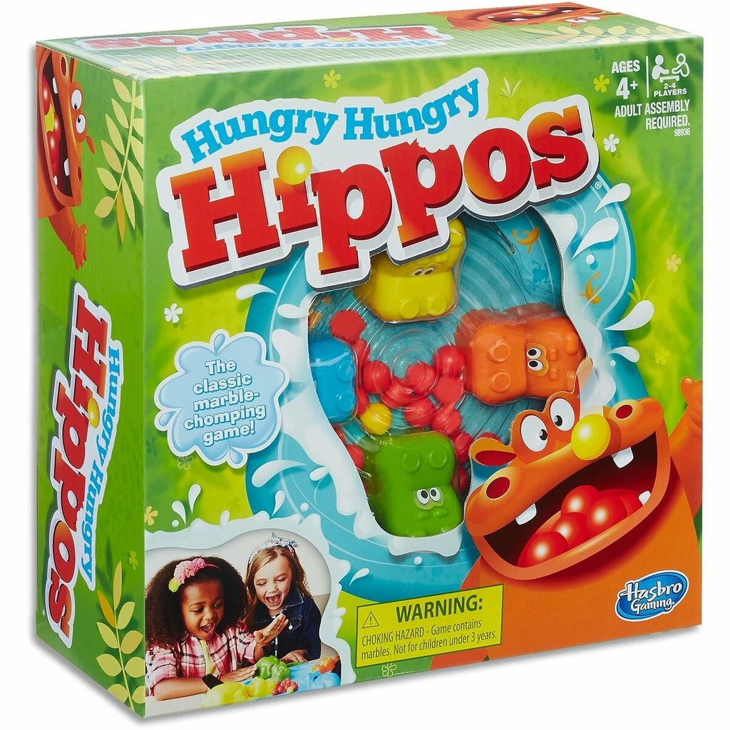 - Classic Hungry Hippos game has 4 hippo heads and bodies plus marbles for them to chomp