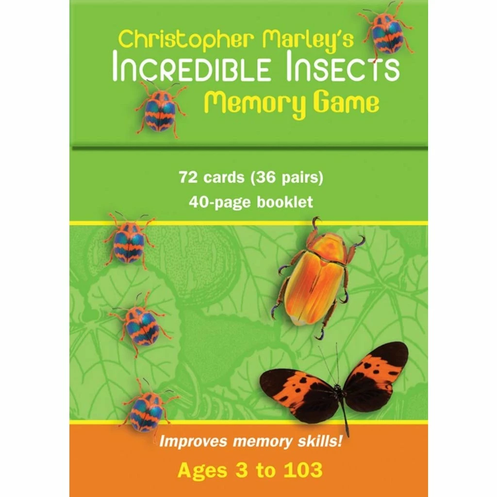 Sharpen your recall with this Incredible Insects Memory™ two or more player card game. Using 36 of designer Christopher Marley’s incredible insects, originally published in his book Pheromone (Pomegranate, 2008), this memory game includes images of beautiful beetles, butterflies, moths, damselflies, weevils, and more. Match pairs to win while enjoying the astonishing diversity of beautiful bugs from around the world. Instructions for play are printed on the bottom of the sturdy, reusable box, which neatly stores cards between games and includes a 40-page information booklet with details about the featured artwork.