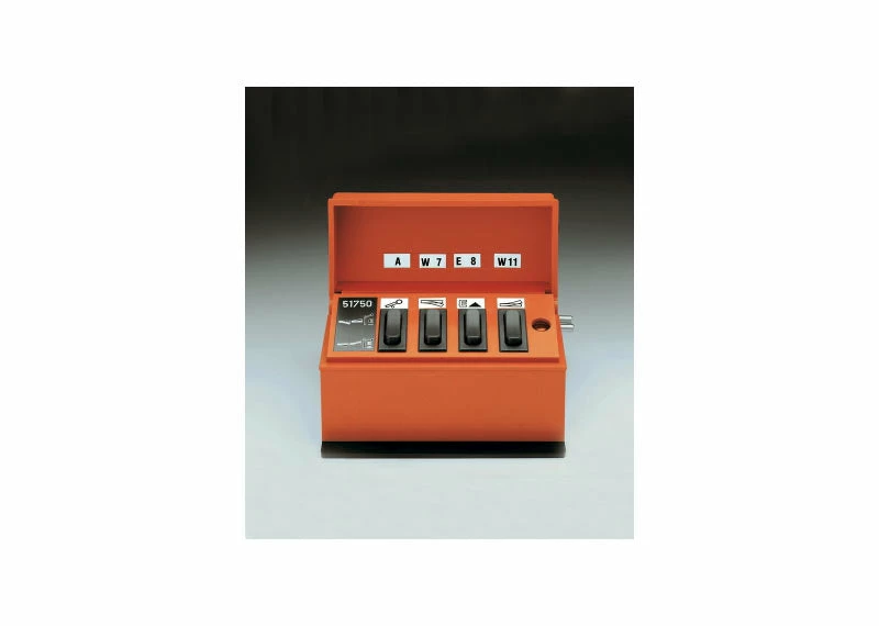 You can control up to four LGB turnouts, signals, uncoupler tracks, or other accessories with this control box. Each rocker switch controls one accessory. The control box is to be connected on the back terminals to an AC power source (18 volts). An LED indicates that the box is receiving power. Color-coded terminals on the back make accessory connections easy. Stickers for accessory symbols are included. 126 x 116 x 66 mm / 5” x 4-9/16” x 2-5/8”