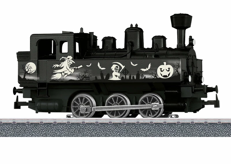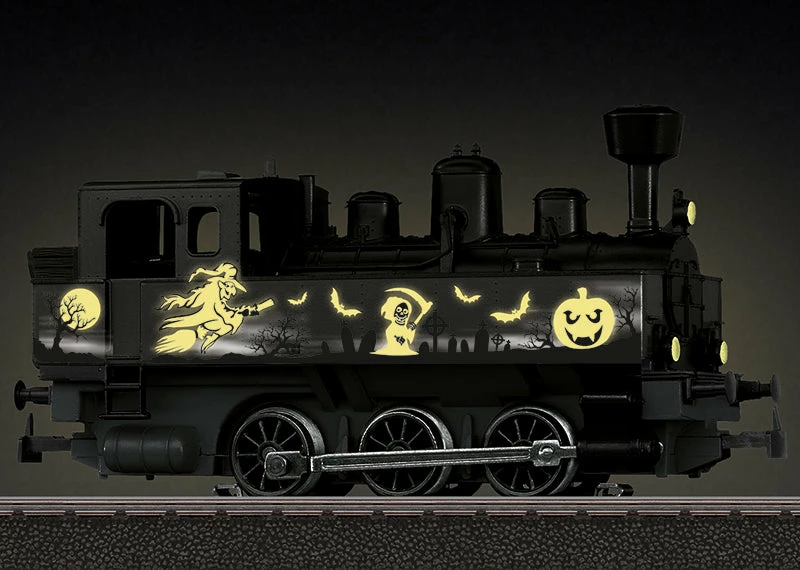 This steam locomotive has a scary Halloween design. It has custom imprinting elements and the triple headlights glow in the dark. An mfx digital decoder is included. 1 axle powered. Traction tires. The locomotive has coupler hooks.