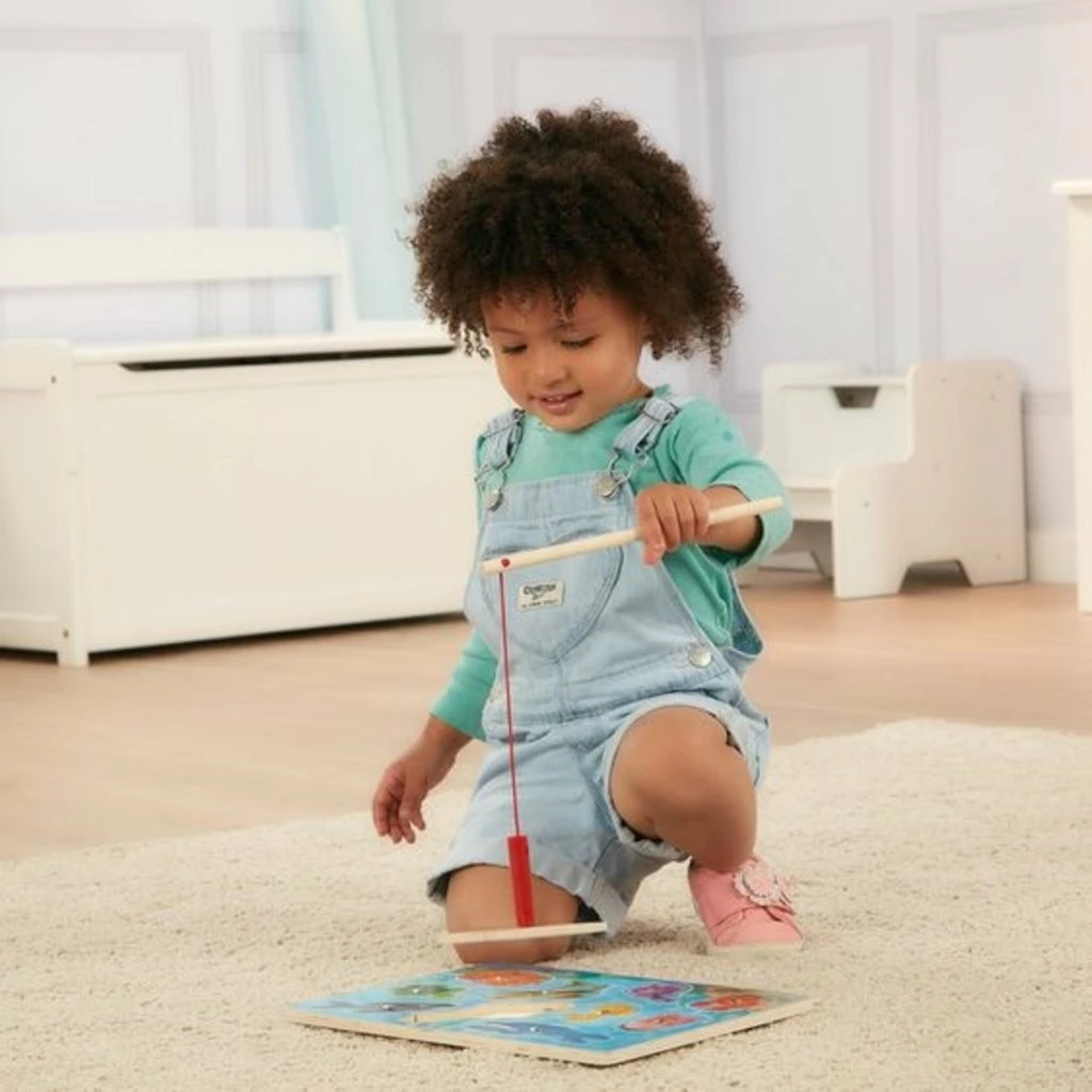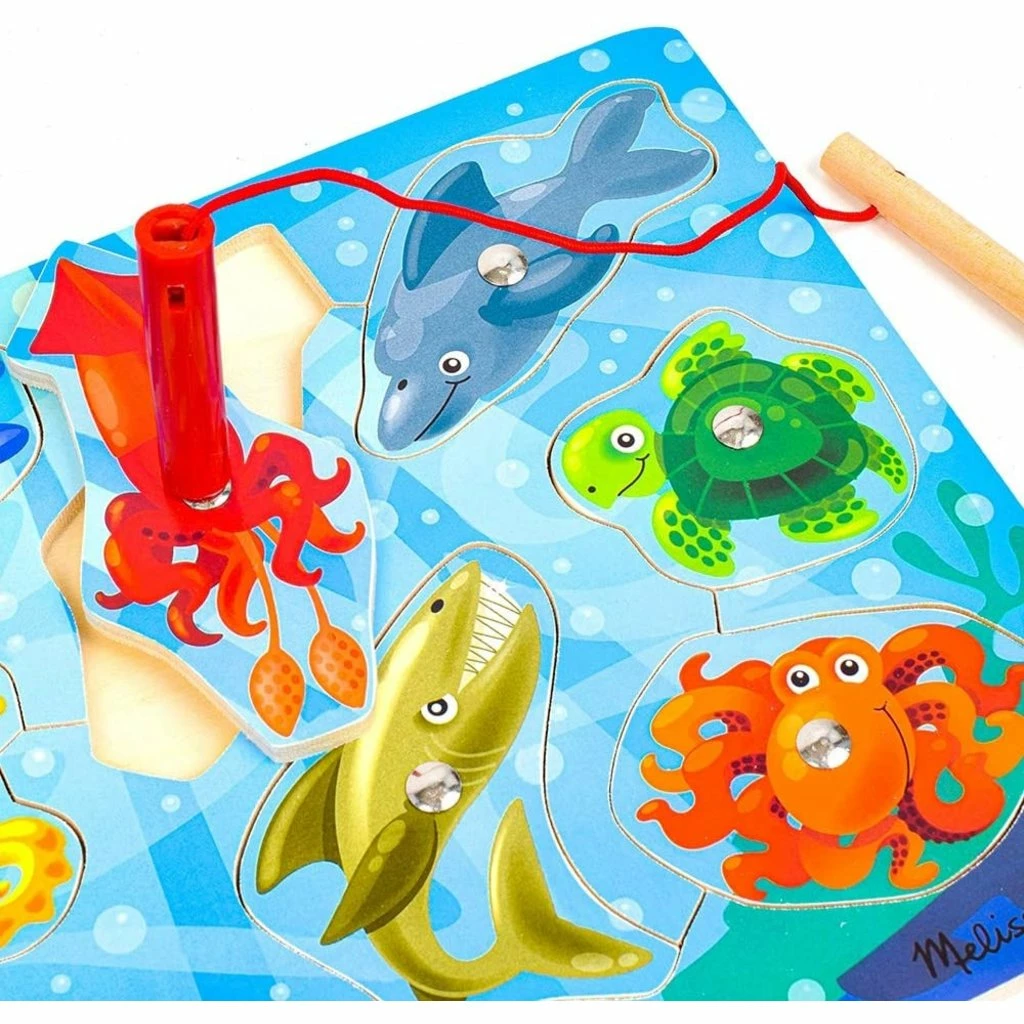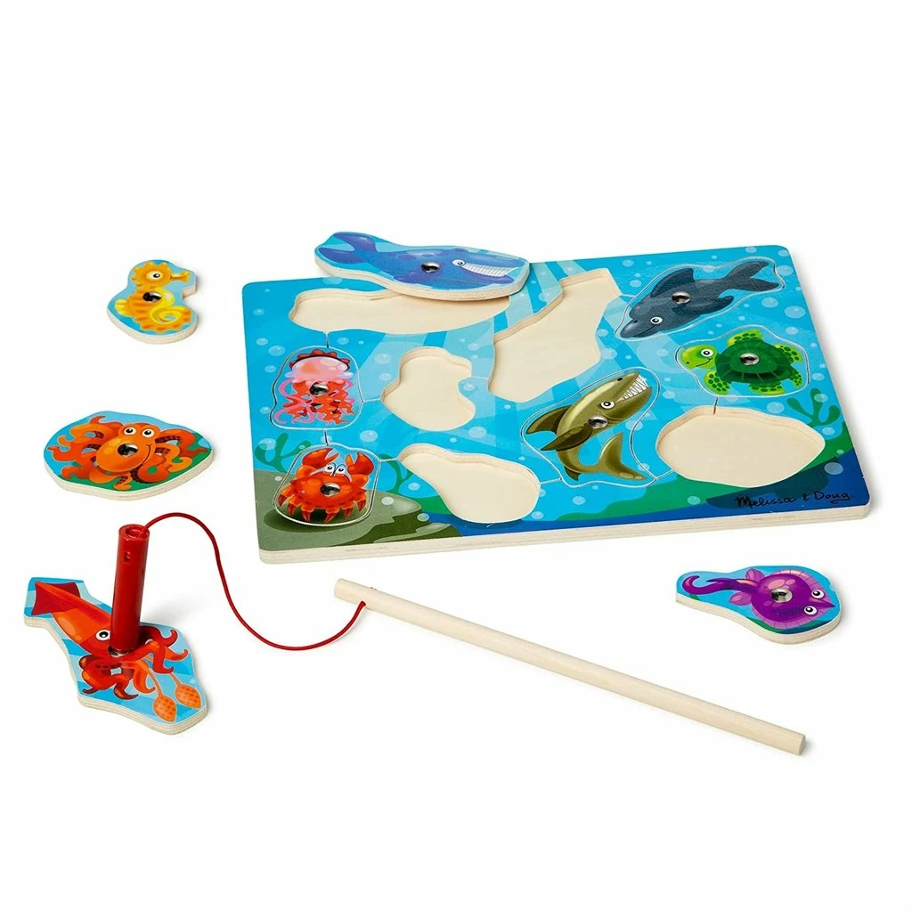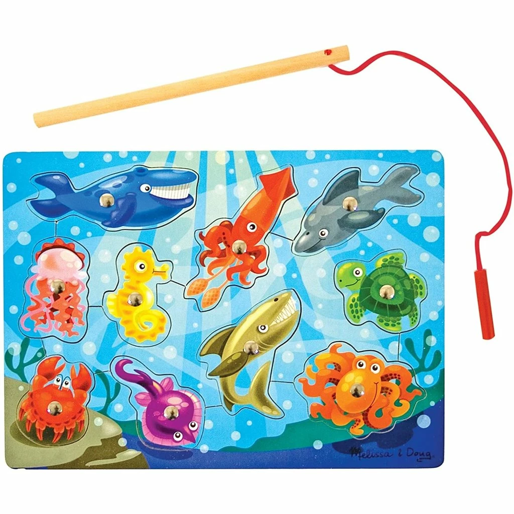 The ultimate catch-and-release fishing program, this Magnetic Fishing Game features aquatic animal artwork. Use the magnetic fishing pole to “catch” the 10 colorful sea friends from the game board, then enjoy the challenge of returning them to the depths! A creative way to encourage hand-eye coordination and fine motor skills, designed by world renowned toy artists Melissa & Doug!