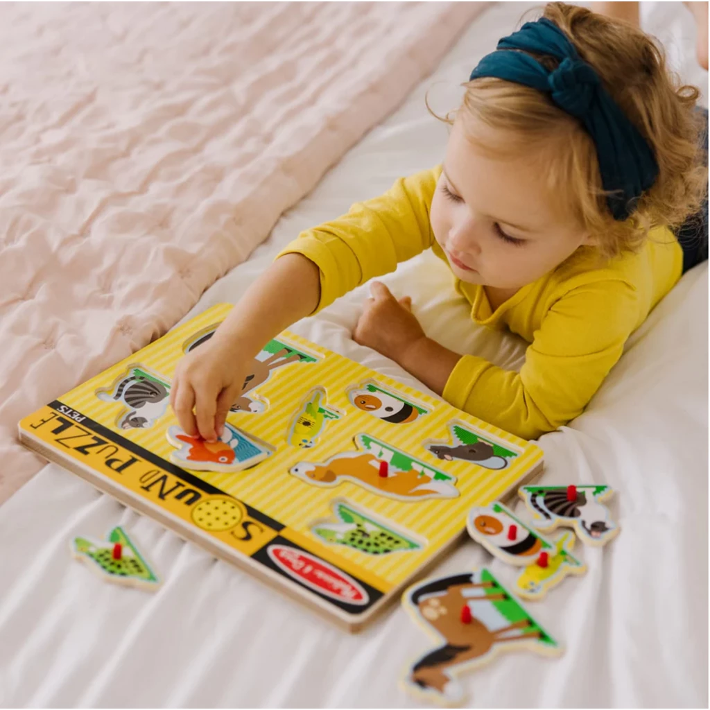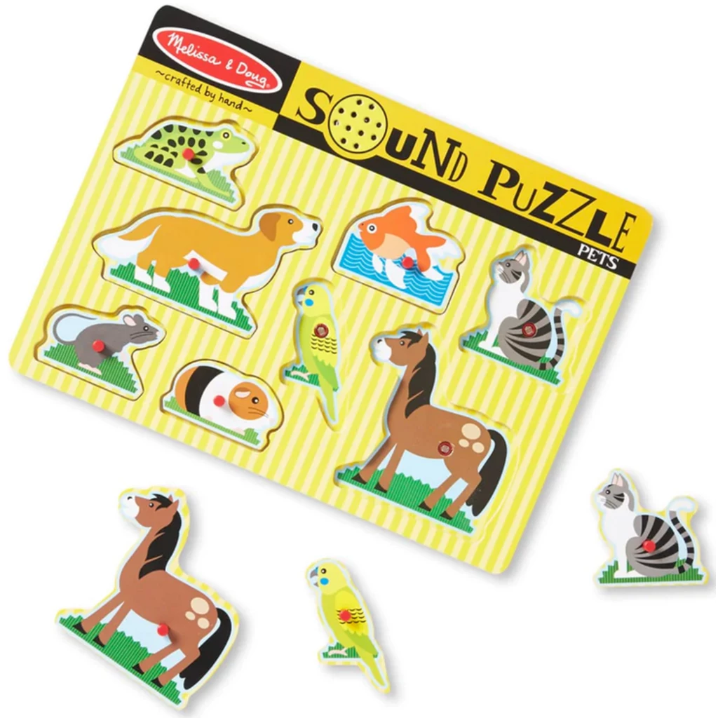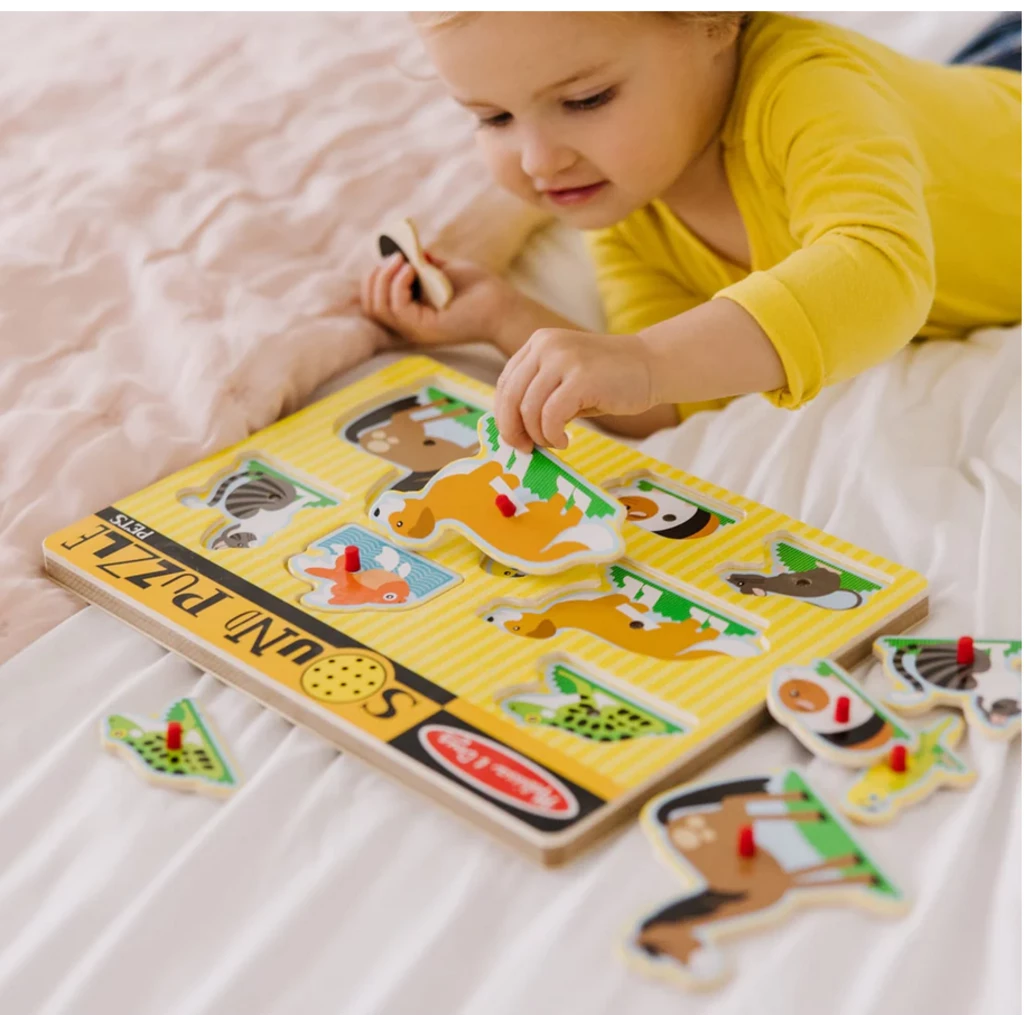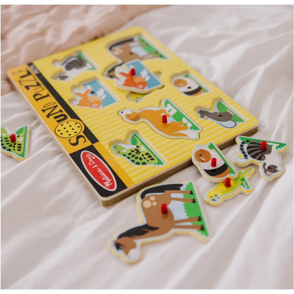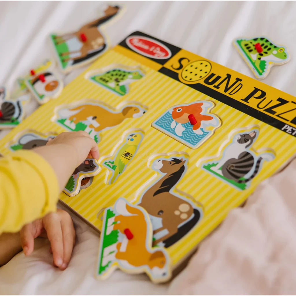 - With the Sound Puzzle: Pets from Melissa & Doug®, place a puzzle piece correctly in the puzzle board to hear realistic sounds.
