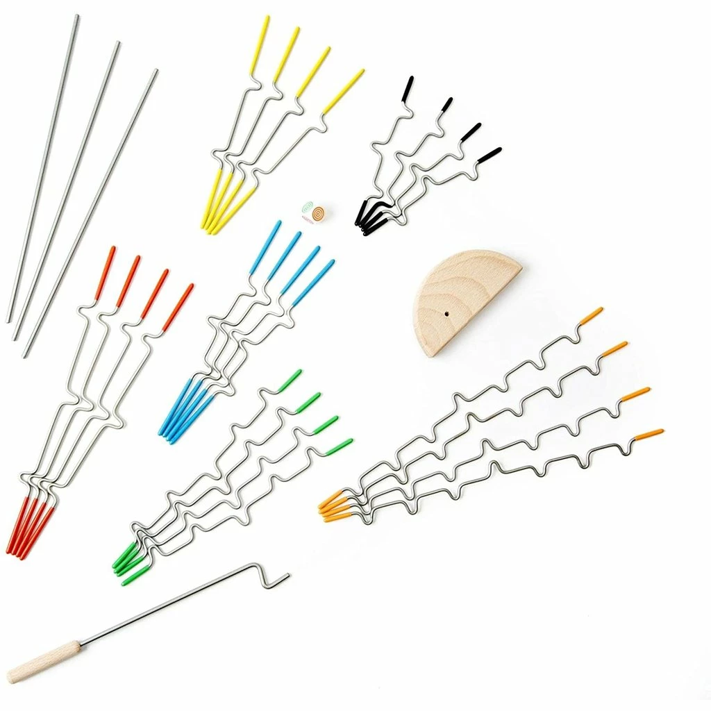 - Includes 24 game rods, wooden base, 4 frame rods, colored die, and wooden connector