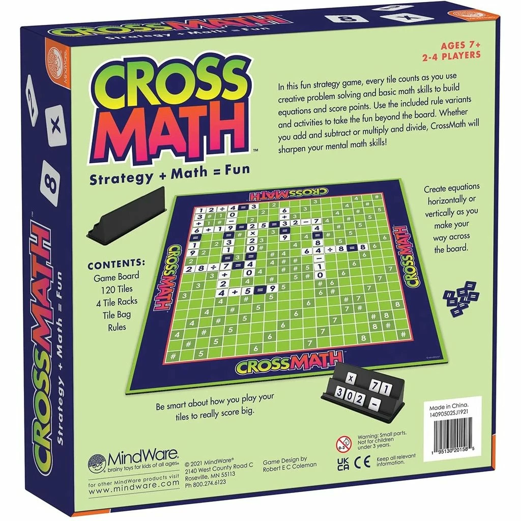 In this fun strategy game, every tile counts as you use creative problem solving and basic math skills to build equations and score points. Use the included rule variants and activities to take the fun beyond the board. Whether you add and subtract or multiply and divide, CrossMath™ will sharpen your mental math skills!