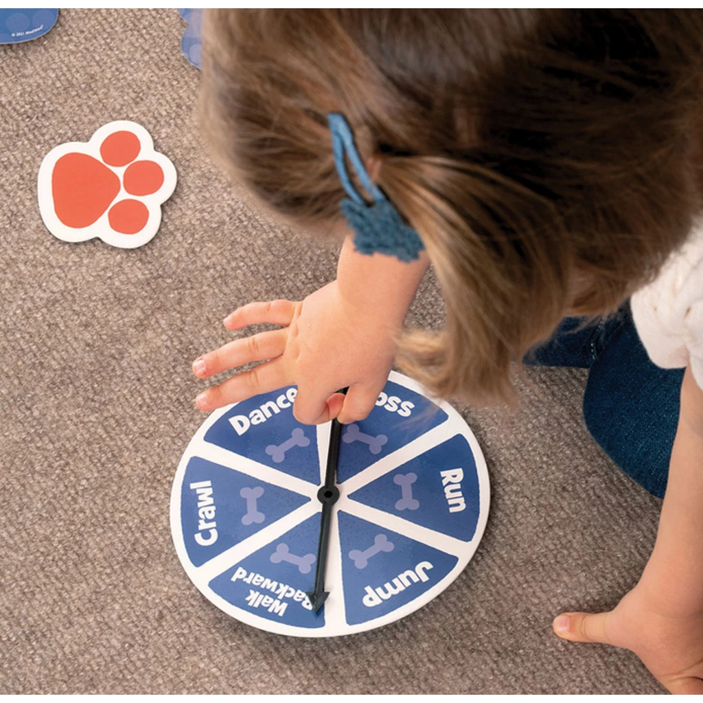 - Includes 4 puppy cards, 4 paw print cards, 4 stuffed bones, 1 spinner, instructions and a parent guide.