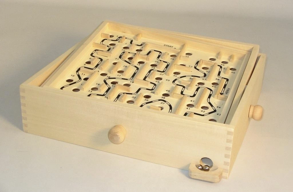 Maneuver the steel ball through the wooden maze without falling into any of the holes. The surface may have numerous tiny pits and bumps, making the behavior of the ball all the more erratic, but that arguably adds to the challenge. An unplugged precursor to video games.