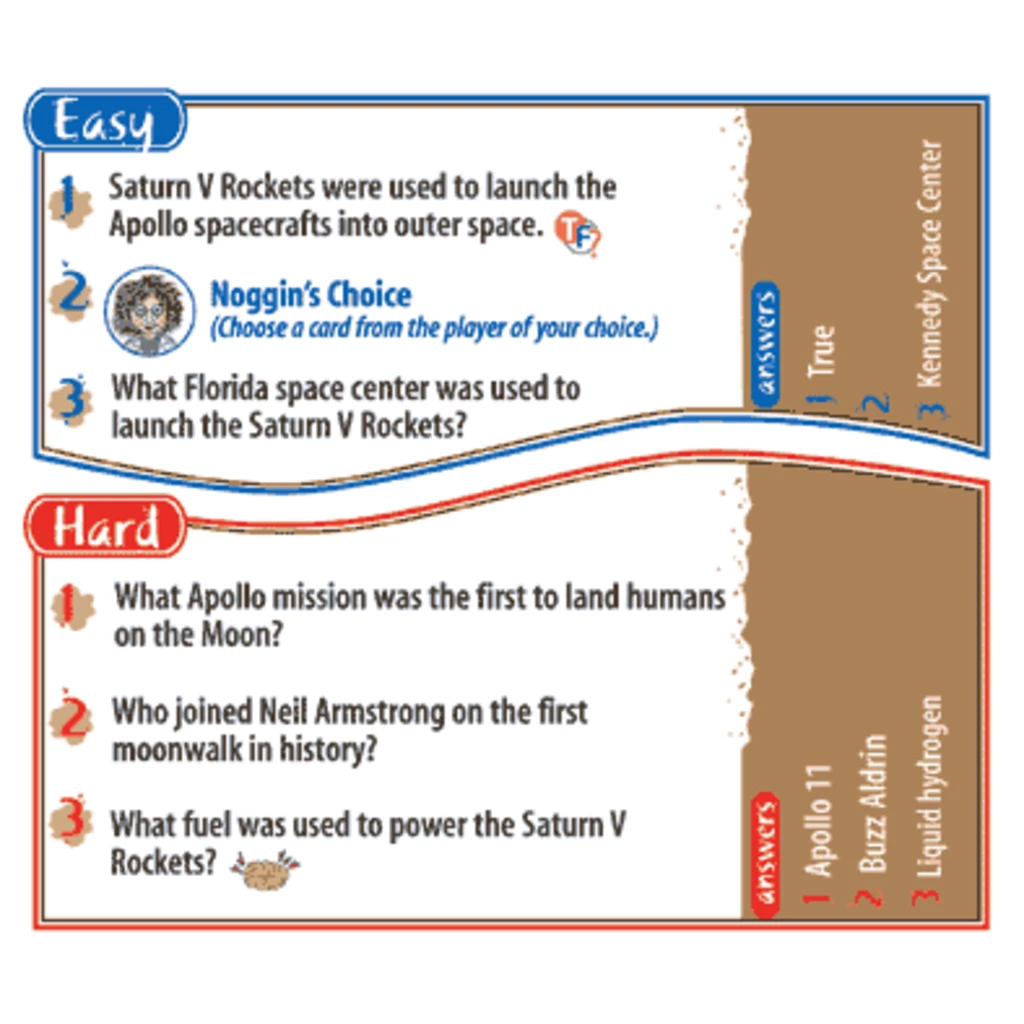 - Professor Noggin’s card games include 30 Topic Cards in each box. Each card has 3 easy questions and 3 hard questions for a total of 180 questions in the game. If a question is answered incorrectly, it goes back to the bottom of the card pile. Because the question is decided by the roll of the die, if the same card comes up again, one may or may not get the same question. It’s a fun way to learn all about your favorite subjects!
