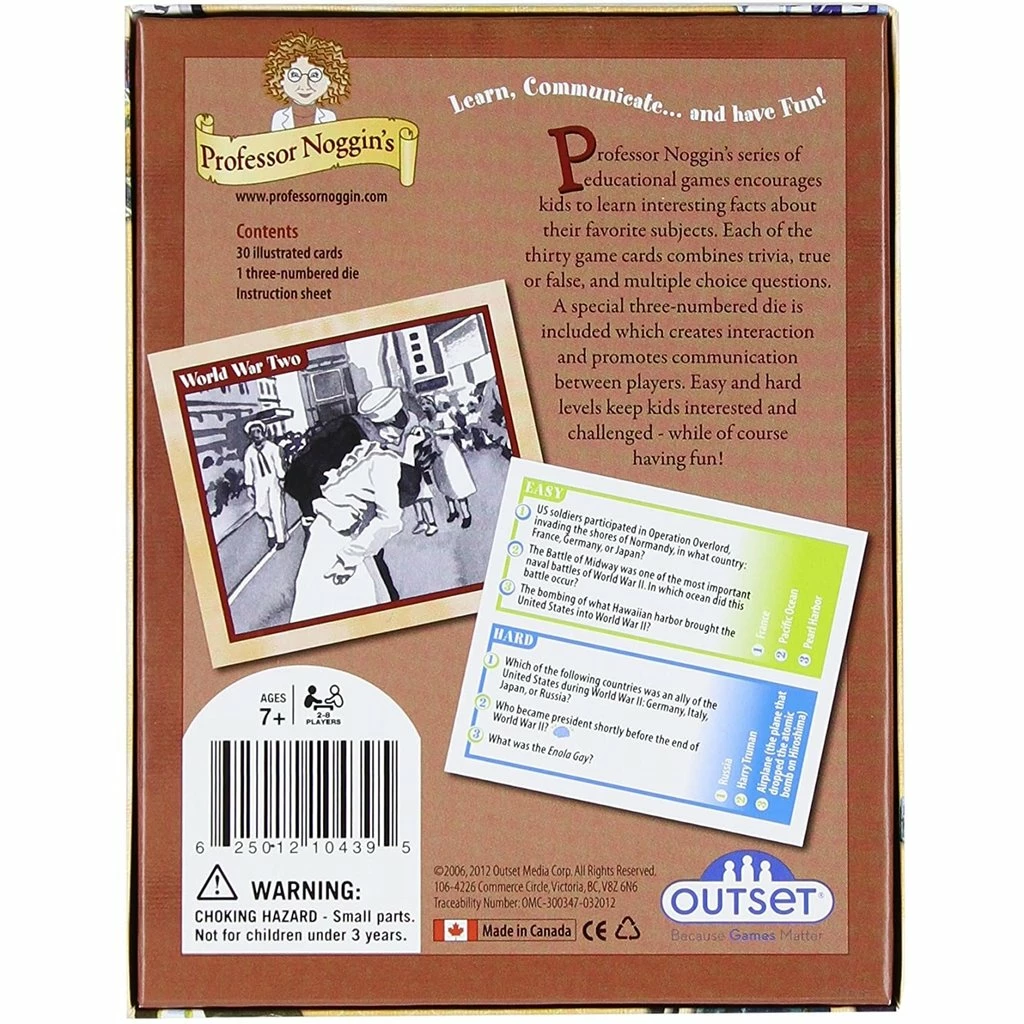 Players take turns rolling the die and asking each other questions from the cards. If a question is answered correctly, the card is won; if answered incorrectly, the card is returned to the bottom of the pile. The player with the most cards at the end of the game is the winner. Players have a few chances throughout the game to get a Noggin’s Choice card. This means they can choose a card from any other player, and get ahead. Remember the correct answers. If a question is not answered correctly the first time, that question will come up again.