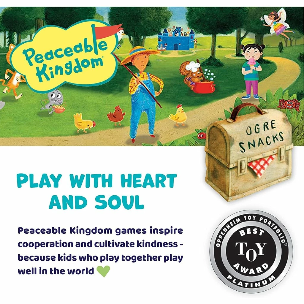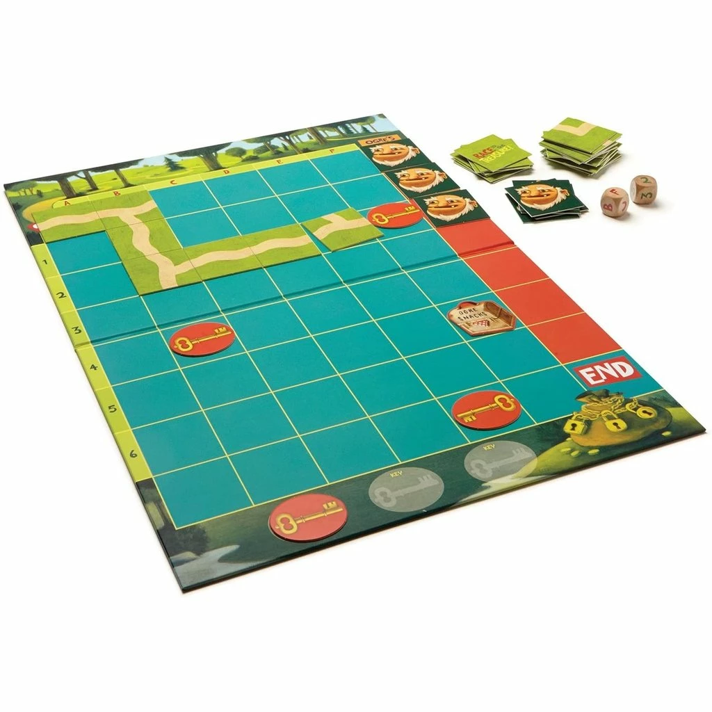 Players try to beat the ogre to the treasure by creating a path from START to END. Along the way they need to collect three keys to open the treasure. Players strategize, cooperate, and build the path together. If they do it before the ogre gets there, they all win! Kids love working together to defeat the ogre. Building onto a path encourages kids to think two steps ahead and to look at all possibilities. Game play changes each game depending on where the keys are placed.