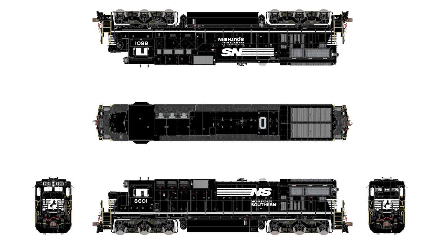 Pleased with their performance, an additional 50 units were delivered in 1985, NS 8564-8613. “Phase II” units, they differed from the previous orders by featuring high-capacity dynamic brakes that resulted in an additional dynamic brake intake and exhaust opening (for a total of three), a handbrake wheel instead of ratchet handbrake, and a larger 4,400 gallon fuel tank replacing the 3,900 gallon tank of previous orders. Also eliminated were the vertical grab iron “ladder strips” on the end of the long hood. Rounding out the NS fleet would be an additional 50 units, built in two batches of 25 units each, NS 8614-8638 and NS 8639-8663, delivered in 1986. These so-called “Phase III” units would feature even more subtle changes; the radiator grills at the end of the long hood featured a slightly different configuration and a flush mounting, the cab doors changed to a square-cornered design, and the units featured a tall 42” snowplow at both ends, in contrast with the smaller 35” plow of previous deliveries.