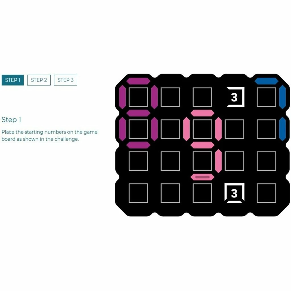 - Game includes: Game board, puzzle pieces 0 to 9, and booklet with 120 challenges and solutions.