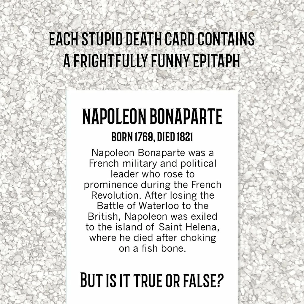 - Race around the game board, working together and competitively to decipher which stupid deaths are actually true. Watch out for the Grim Reaper – if he catches you, you’re dead!