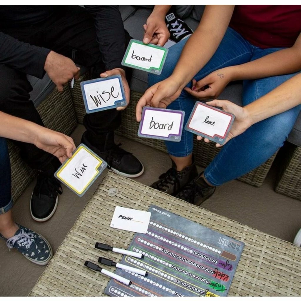 - Game set includes: 1 scoreboard, 8 dry erase slates, 8 dry erase markers with erasers, 250 double-sided Word Cue cards, and rules.