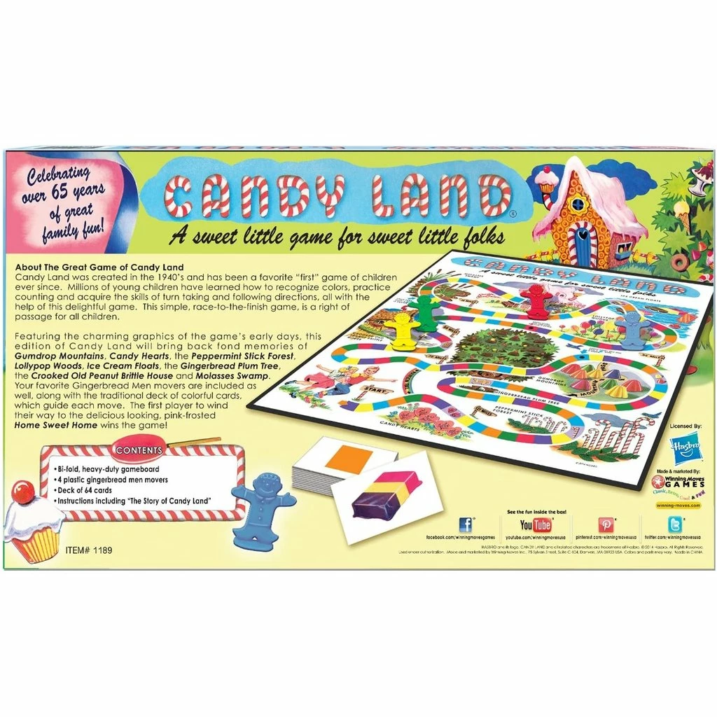 Celebrating over 65 years of great family fun, this classic edition of Candy Land features the charming graphics and components from the game’s early days. Candy Land was created in the 1940’s and has been a favorite “first” game of children ever since. Millions of young children have learned how to recognize colors, practice counting and acquire the skills of taking turns and following directions, all with the help of this delightful game. This simple, race-to-the-finish game, is a rite of passage for all children. In 2005 the game was inducted into the National Toy Hall of Fame at The Strong Museum in Rochester, New York. This edition of Candy Land will bring back fond memories of Gumdrop Mountains, Candy Hearts, the Peppermint Stick Forest, Lollypop Woods, Ice Cream Floats, the Gingerbread Plum Tree, the Crooked Old Peanut Brittle House and Molasses Swamp. Your favorite Gingerbread Men movers are included, along with the traditional deck of colorful cards, which guide each move. The first player to wind their way to the pink-frosted Home Sweet Home wins the game! Playing Time 15-20 minutes for 2-4 players. Contents include a Bi-fold, heavy duty game board, 4 plastic gingerbread men movers, a deck of 64 cards and Instructions that includes “The Story of Candy Land”.