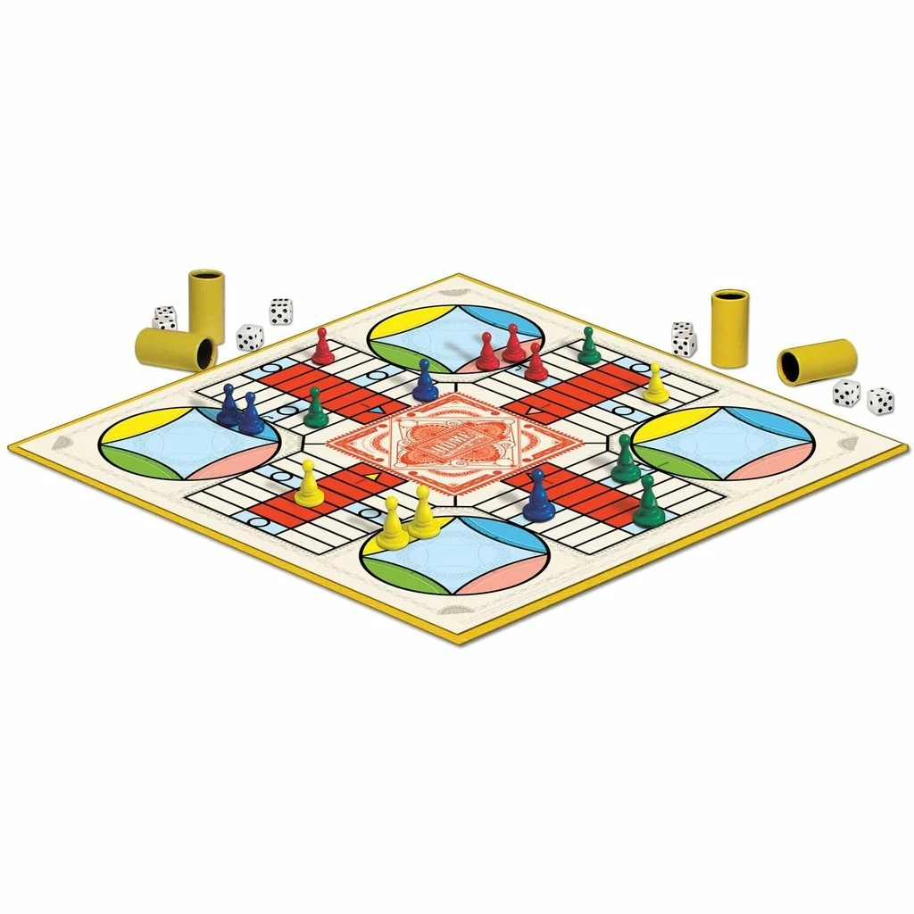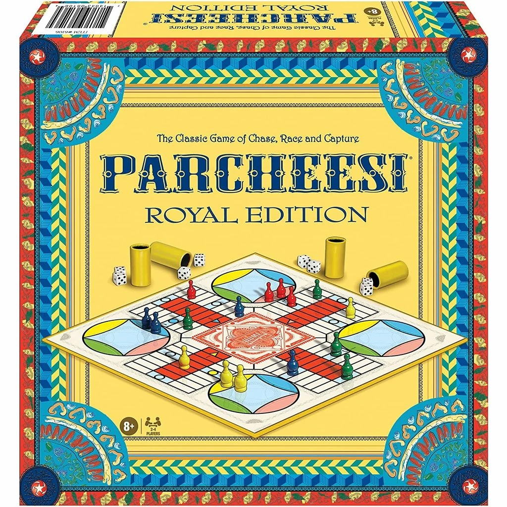 The classic game of chase, race and capture, Parcheesi® has been enjoyed by players of all ages for over 100 years. The cherished look and feel of Parcheesi®, including the dice cups, will surely bring back fond memories. Parcheesi® Royal Edition comes fully equipped with high-quality pawns, dice and dice cups for every player and a beautifully designed deluxe game board. Revel in the fun of blockades and captures, bonus moves and lucky doublets with this fine edition of Parcheesi®! Deluxe edition includes: Deluxe game board, 16 pawns (4 sets of 4 colors – blue, green, red and yellow), 8 dice, 4 dice cups and illustrated instructions.