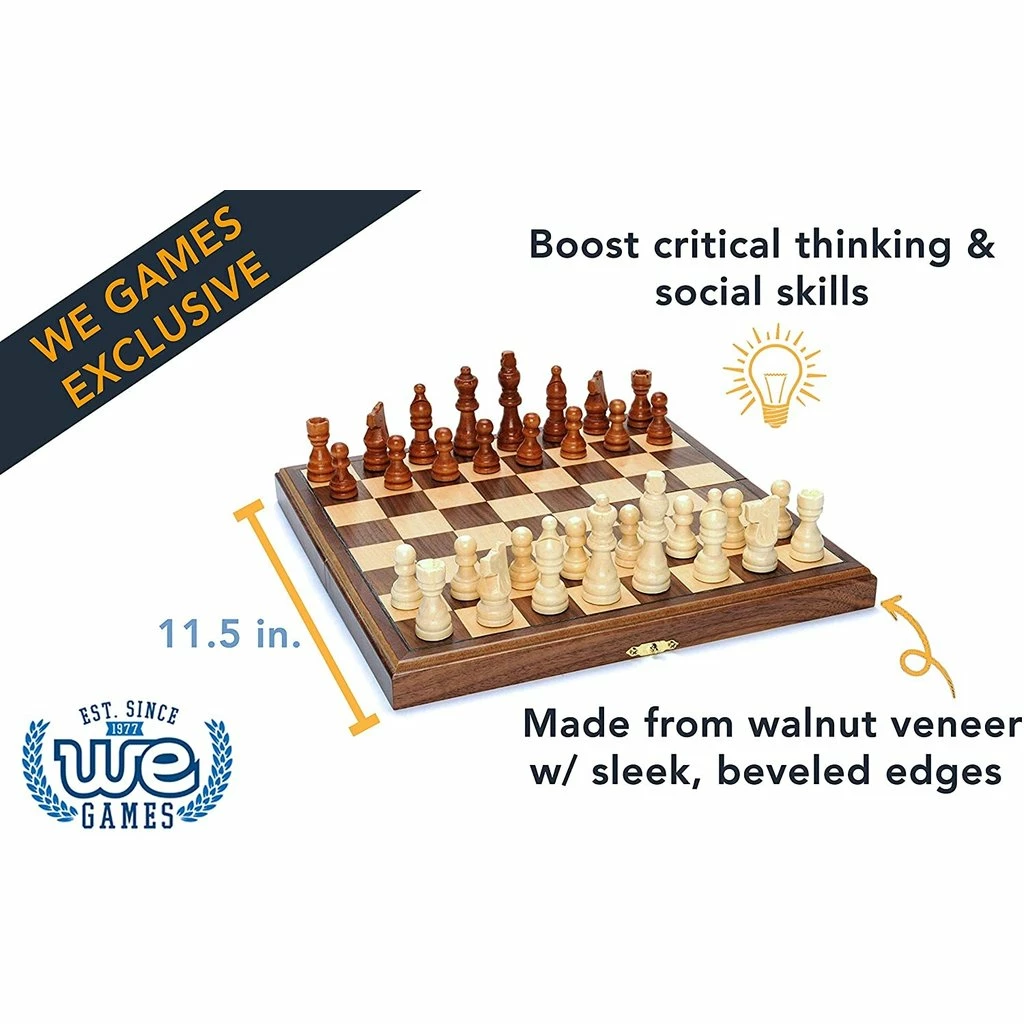 Enjoy one of the world’s most cherished games on the go! This set contains a walnut chess board, lined in brown billard style felt and 32 chessmen in light and dark wood stains. The board measures 12 inches with 1.5 inch squares and the King is 3 inches tall. Made from walnut veneer with a smooth finish and beveled edges, this board is heirloom quality. This refined set is perfect for beginners and seasoned players alike. The smart design makes it so the pieces can be stored in the compartment that forms once the board is folded. Equipped with a sturdy metal clasp, so pieces are secure during travel. Once folded, slide right into your backpack and get ready to play anywhere from your next tournament to the neighborhood park.