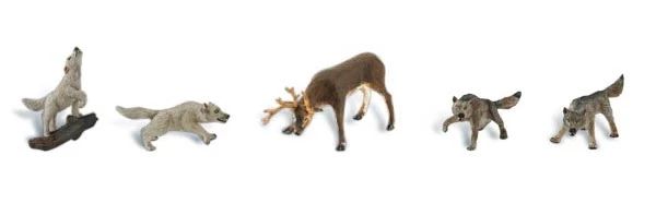 A feisty trophy-buck fends off three wolves while the fourth howls for reinforcements.
