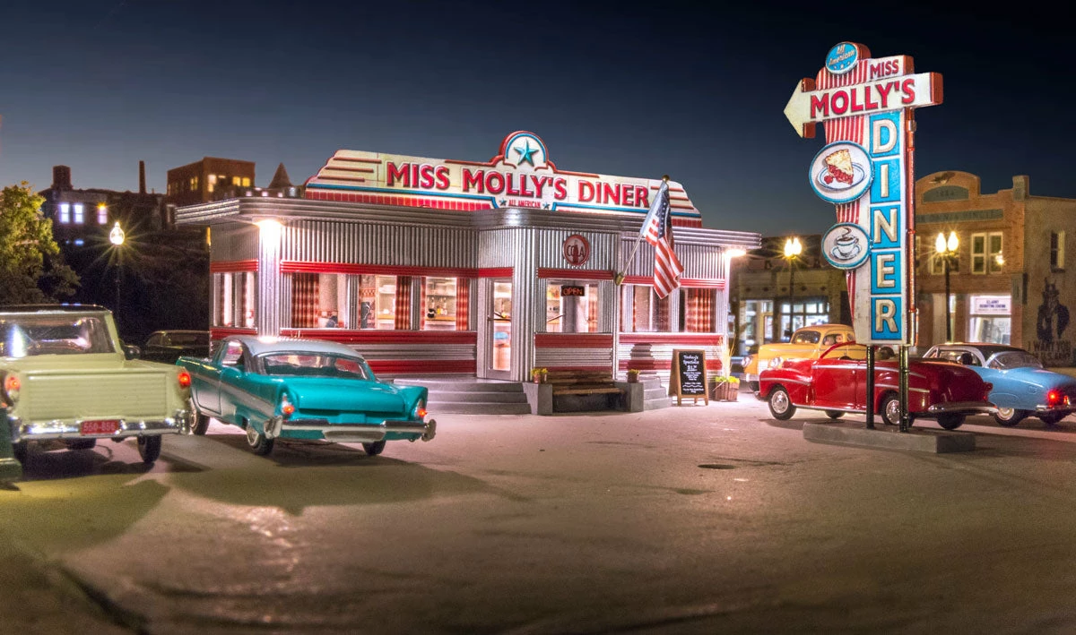 Miss Molly’s Diner welcomes you with a spoonful of some good home cookin’. This HO Scale Built-&-Ready® is styled like a train car eatery, hand-painted and authentically weathered for realism. It features a detached, classic sign, a menu board and other details for custom placement. The ready-made structure has an eye-catching printed interior complete with booths, a kitchen and other authentic diner features. This local establishment is open for business on your layout right of the package.