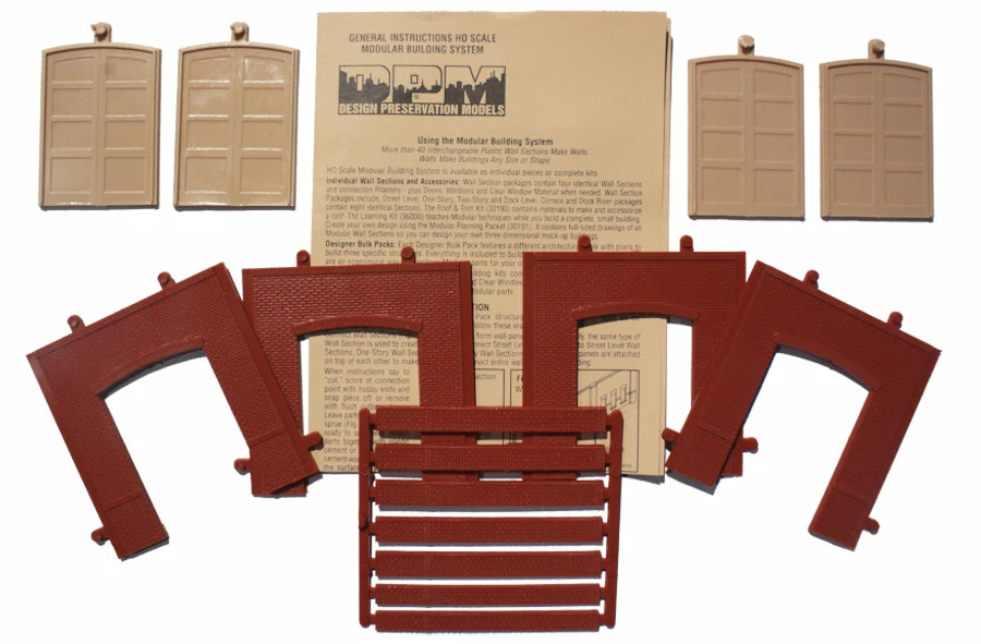 Interchangeable plastic wall sections make it possible to create buildings of any size, shape and height. Build a variety of styles – whatever you want or need. Packages include four identical wall sections with pilasters, plus doors, windows and clear window material where needed. All sections are the same width (2-3/4″ 7cm) and color. Cornice packages include eight sections of Cornice with Cornice pilasters, Dock Riser Wall packages include eight Dock Riser Wall sections with dock pilasters. Powerhouse Window packages include two two-story windows and four walls.