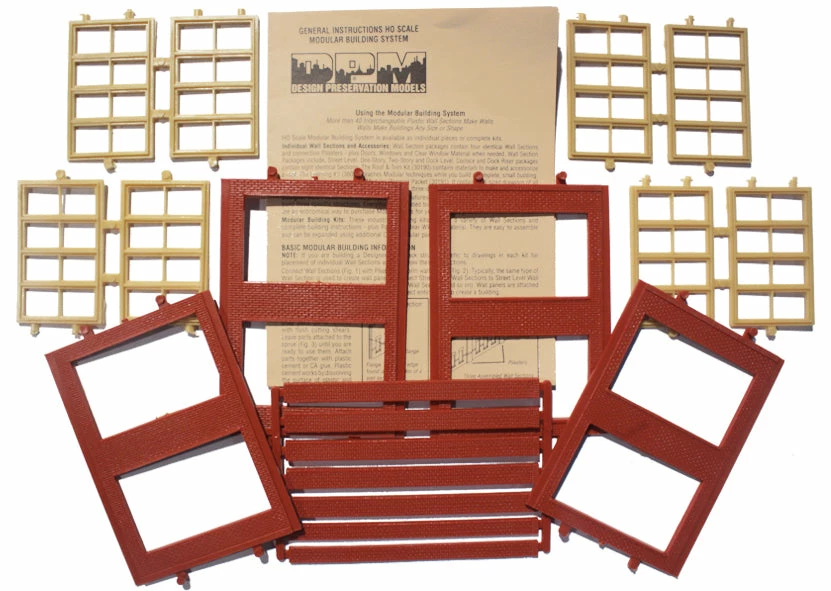 Interchangeable plastic wall sections make it possible to create buildings of any size, shape and height. Build a variety of styles – whatever you want or need. Packages include four identical wall sections with pilasters, plus doors, windows and clear window material where needed. All sections are the same width (2-3/4″ 7cm) and color. Cornice packages include eight sections of Cornice with Cornice pilasters, Dock Riser Wall packages include eight Dock Riser Wall sections with dock pilasters. Powerhouse Window packages include two two-story windows and four walls.