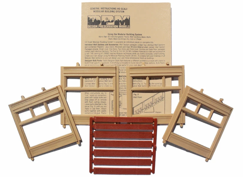 Interchangeable plastic wall sections make it possible to create buildings of any size, shape and height. Build a variety of styles – whatever you want or need. Packages include four identical wall sections with pilasters, plus doors, windows and clear window material where needed. All sections are the same width (2-3/4″ 7cm) and color. Cornice packages include eight sections of Cornice with Cornice pilasters, Dock Riser Wall packages include eight Dock Riser Wall sections with dock pilasters. Powerhouse Window packages include two two-story windows and four walls.