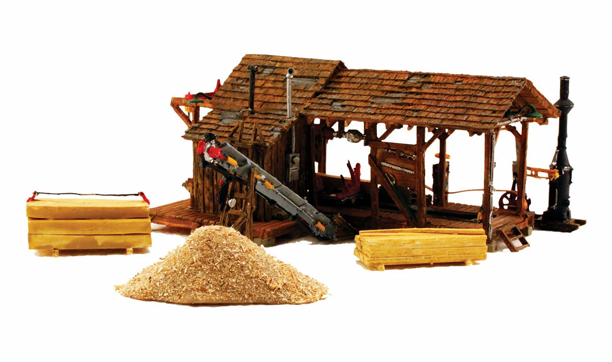 Buzz’s Sawmill is a detailed work of art with all workings of a vintage steam-fired, belt-driven sawmill. The positive alignment system and prefinished edges ensure a quick, easy assembly. Details include interior rafters and shake roof, attached tool shed, pot belly stove, steam engine, sawdust conveyor, overhead crane, loads of tools, sawdust and wood piles, Buzz figure and many more! See photos for footprint.