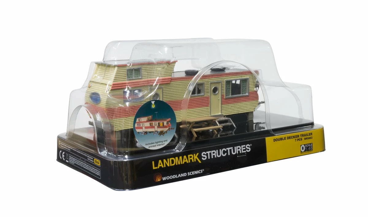Whether you’re having lunch outside or watching late-night TV, the Double Decker Trailer is perfect for taking your layout to the next level. Building details include a window A/C unit, multiple doors and windows, cinder blocks, TV antenna and a trailer hitch. This multi-level trailer also features an unattached picnic table, trashcan and propane tank for custom placement. See photos for footprint.